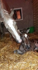 Oona oli rauhallinen ja hoiti osuutensa ihan itse. Sillähän on jo kolme varsaa ennestäänkin. Se kannusti varsaa nousemaan jaloilleen ja seisoi liikkumatta kun varsa hamusi eka kertaa tissiä.